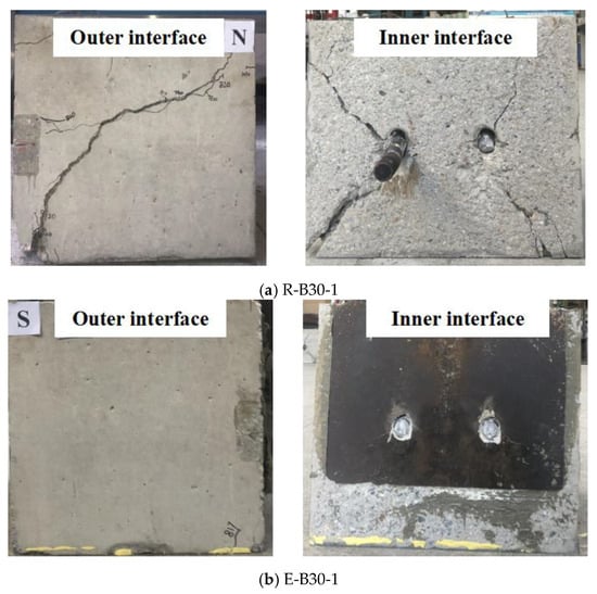 - Compared with specimens with barely roughened interfaces, epoxy resin and epoxy mortar employed at the steel–concrete interface can increase the shear-bearing capacity of connections by approximately 47.71% and 43.46%, respectively. The interface treatment method using epoxy mortar can also improve the ductility and stiffness, while the specimen smeared with epoxy resin has excessive stiffness, and the failure mode belongs to brittle failure. The slippage of the specimen smeared with epoxy resin was 0.78 mm at peak load, which was significantly lower than the 8.23 mm slippage of the specimen with the epoxy mortar layer.