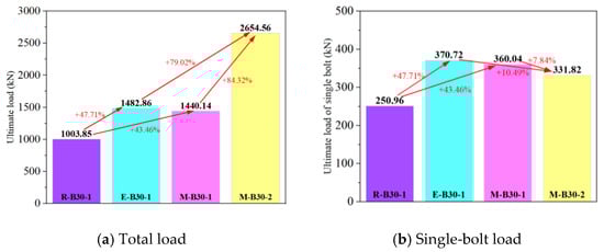- Compared with the specimen with a single row of bolts, the shear-bearing capacity of a single bolt in the specimen with two rows of bolts exhibited approximately an 8% reduction, due to the uneven transmission of stress and concrete overstressing.