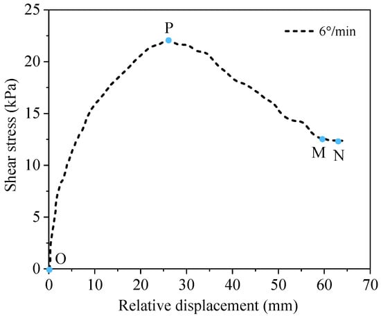 δ relationship for the interface between sand and a smooth steel surface. This curve can be characterized by three distinct phases: the elastic–plastic growth stage (OP), the plastic softening stage (PM), and the residual friction stage (MN).