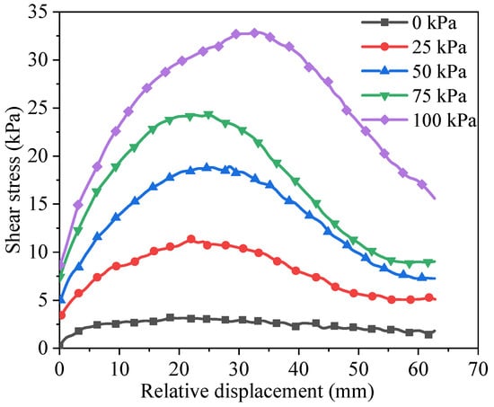 Figure 7. As evident from the figure, the vertical confining pressure significantly affects the shear stress–relative displacement relationship at the smooth sand–steel interface. As the vertical pressure increases, both the peak shear stress and the residual shear stress increase significantly, with the peak shear stress reaching 3.213 kPa, 11.37 kPa, 18.758 kPa, 24.361 kPa, and 32.906 kPa, respectively. The relative displacement corresponding to the peak shear stress also increases with rising pressure. Notably, when the vertical pressure is 0 kPa, the initial shear stress is not zero, indicating the presence of not only sliding friction but also noticeable cohesion, or adhesive force, between the sand and steel structure. As the vertical pressure increases, the initial shear stress during the relative displacement at the smooth sand–steel interface also increases. This phenomenon follows a similar principle: in order to generate sliding friction, the maximum static friction force must first be overcome, and as the normal stress on the interface increases, the maximum static friction force increases correspondingly.