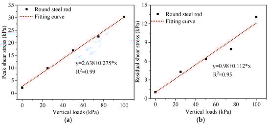 For the interface shear strength, there are two parameters: peak shear stress and residual shear stress. The peak shear stress is taken as the smooth sand–steel interface shear strength, while the variation in the residual shear stress is analyzed. In addition, the shear stress values obtained in this experiment must be corrected by the instrument to subtract the shear stress generated by the hollow rotation of the vertical rod in the sand sample, i.e., the shear stress solely generated by the round steel rod. The peak shear stress and residual shear stress of the smooth sand–steel interface under different vertical pressures are shown in