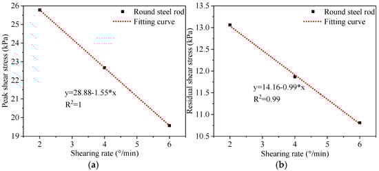 For the interface shear failure strength, both the peak shear stress and the residual shear stress were considered. The peak shear stress was defined as the interface failure strength, while the evolution of the residual shear stress was also examined. Furthermore, all shear stress measurements obtained from this experiment were corrected by subtracting the shear stress value generated by the vertical rod in the sand sample during the idling phase. This value represents the contribution solely from the round steel rod. The corrected peak and residual shear stress values at the smooth sand–steel interface, measured under different shear rates, are presented in
