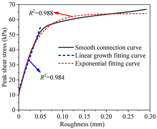 Figure 13. To further analyze the data, an exponential fitting curve was superimposed on the same figure, and the corresponding functional relationship of the exponential curve is provided. This analysis highlights the correlation between surface roughness and the interfacial shear failure strength, offering valuable insights into the behavior of the sand–steel interface under different surface conditions.