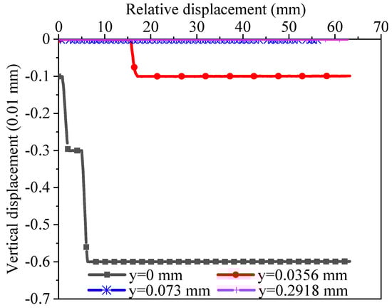 Figure 14 illustrates the motion characteristics of standard sand under various surface roughness conditions. At lower surface roughness levels (e.g., y = 0 mm and y = 0.0356 mm), the vertical displacement of the standard sand exhibits notable fluctuations. Specifically, at y = 0 mm, the vertical displacement decreases sharply at the initial stage and then stabilizes, indicating deeper embedding of the standard sand and more pronounced free sliding at lower roughness interfaces. At y = 0.0356 mm, the vertical displacement shows less fluctuation but follows a similar trend. Under higher surface roughness conditions (e.g., y = 0.073 mm and y = 0.2918 mm), the vertical displacement remains almost constant in the early stage and rapidly approaches saturation. This behavior can be attributed to the increased number of anchoring points provided by the rough interface, which generates greater vertical embedding forces, thereby restricting vertical movement. In contrast, the horizontal displacement (relative displacement) of the standard sand continues to increase. As shown in the figure, the growth trend of horizontal displacement remains relatively consistent across different roughness conditions, suggesting that surface roughness has a weaker impact on horizontal displacement.