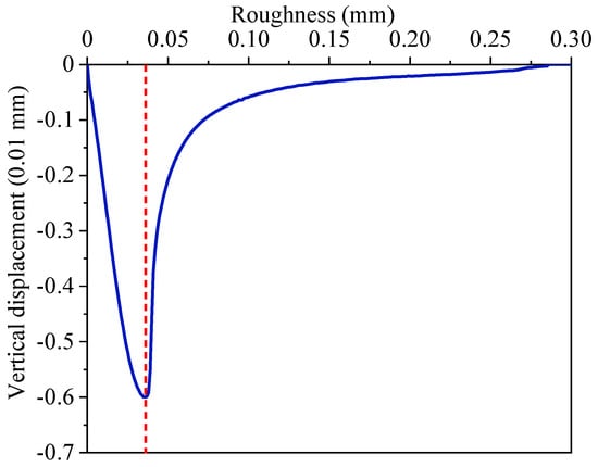 Figure 15 illustrates that within the range of surface roughness less than 0.036 mm, the absolute value of the vertical displacement increases sharply. This phenomenon reflects the rapid embedding and adjustment process of particles occurring at the interface. At this stage, due to the relatively low surface roughness, the contact between the sand particles and the steel surface becomes smoother. As a result, the frictional resistance and embedding forces between the particles are reduced, allowing the particles to slide and rearrange more freely, leading to a denser contact configuration. As the surface roughness increases to the range between 0.036 mm and 0.15 mm, the sand particles gradually embed into the concave–convex structures of the steel surface. This results in an increased number of contact points, enhanced interfacial friction and embedding forces, and a reduction in the rate of change in vertical displacement. This phase reflects the progressive stabilization of the contact network among the particles. When the surface roughness exceeds approximately 0.036 mm, the variation in the vertical displacement begins to stabilize, indicating that the particle embedding depth has reached a limiting value. Beyond this point, further increases in the surface roughness have a diminished effect on particle movement and interfacial embedding forces, with the overall mechanical behavior being predominantly controlled by the intrinsic properties of the soil matrix.