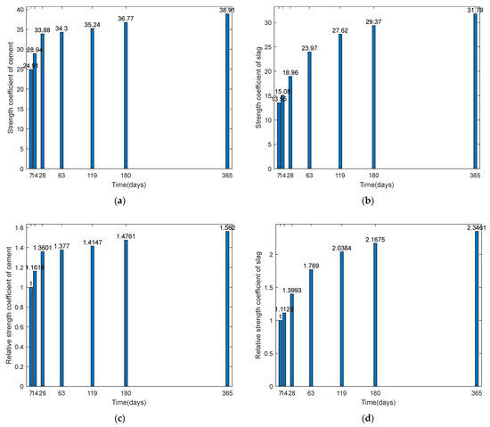 Figure 1 illustrates the relationship between the strength coefficients A, B, and age. In particular, Figure 1a,b depict the relationships between the cement strength coefficient and slag strength coefficient, respectively, with age. As age increases, both coefficients also rise, indicating that the hydration extent of cement and the reaction extent of slag increase with time. Taking the strength coefficients of cement and slag at 7 days as a reference unit (set to 1) and dividing the coefficients at other ages by the 7-day values, the relative strength coefficients for cement and slag at different ages were obtained. Figure 1c shows that, from 7 to 28 days (a 21-day span), the relative strength coefficient of cement rose by approximately 36%. From 28 to 365 days (a 337-day span), it rose by about (1.562 − 1.360)/1.360 × 100% = 14.9%. This suggests that cement reacts rapidly in the early stage, but its reaction slows significantly after 28 days. Figure 1d shows that, from 7 to 28 days (21 days), the relative strength coefficient of slag rose by about 40%, while from 28 to 365 days (337 days), it rose by approximately (2.346 − 1.399)/1.399 × 100% = 67.6%.
