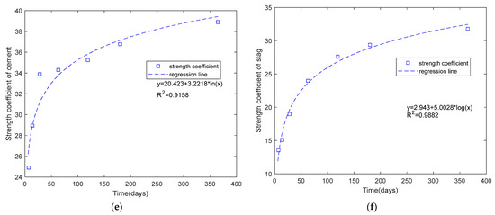 Parameter analysis of the compressive strength prediction Equation (1). (a) Strength coefficient of cement. (b) Strength coefficient of slag. (c) Relative strength coefficient of cement. (d) Relative strength coefficient of slag. (e) Regression equation of cement strength coefficient and age. (f) Regression equation of slag strength coefficient and age.