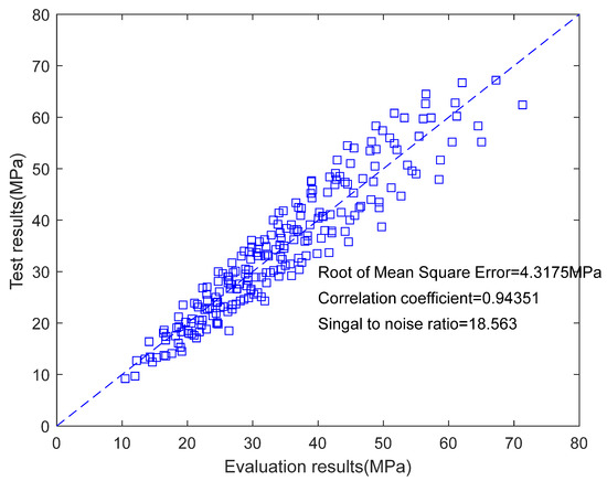 At all ages, the correlation coefficients between calculated and tested results exceeded 0.91, indicating a strong agreement between the predicted and experimental values. At early curing ages of 7 and 14 days, the root mean square error of the strength equation’s predictions was less than 3 MPa while, at 365 days, it was approximately 5 MPa. The signal-to-noise ratios across all ages ranged between 18.7 and 19.3, suggesting good predictive performance of the equation. The signal-to-noise ratios showed no significant fluctuations across ages, demonstrating the overall stability of the predictive equation.