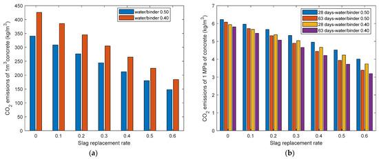 Figure 3a shows the calculated carbon emissions per unit volume of concrete CO2V. Two factors are considered in Figure 3a: the water-to-binder ratio and the slag replacement ratio. For a given water-to-binder ratio of 0.5, when the slag replacement ratio increases from 0 to 0.6, the carbon emissions per unit volume of concrete decrease from 341 to 148 kg/m3. For a given water-to-binder ratio of 0.4, when the slag replacement ratio increases from 0 to 0.6, the carbon emissions per unit volume of concrete decrease from 426 to 184 kg/m3. Figure 3a indicates that, as both the slag replacement ratio and the water-to-binder ratio increase, the carbon emissions per unit volume of concrete decrease.