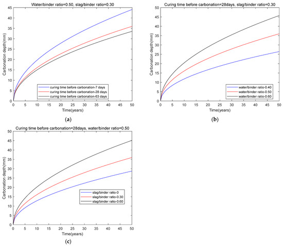 As seen in Figure 4c, the curing age before the start of carbonation was fixed at 28 days and the water-to-binder mass ratio at 0.5 in order to analyze the effect of the slag-to-binder mass ratio. For slag-to-binder mass ratios of 0, 0.30, and 0.60, the carbonation depths after 50 years were 28.70 mm, 35.98 mm, and 45.14 mm, respectively. The increase in the slag-to-binder mass ratio led to an increase in carbonation depth over the carbonation duration.