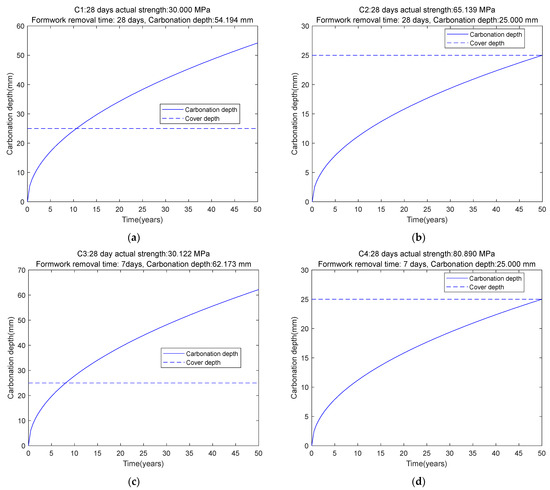 C3 disregards carbonation durability, with the concrete requiring formwork stripping at 7 days. According to construction specifications, the concrete strength at the time of formwork stripping must reach 70% of the design strength [31]; specifically,