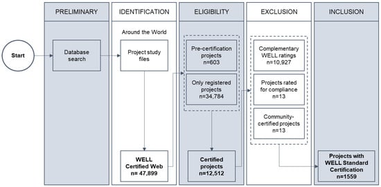 Figure 2 details the selection process of projects for the quantitative analysis. This section follows the methodology developed by Condezo-Solano et al. (2024) in [] for selecting the projects to be evaluated. This methodology consists of five stages, described as follows: In the preliminary stage (1), the WELL project database [] was used as the primary source as it consolidates information on a variety of certified projects across different sectors. In the identification stage (2), 47,899 projects were retrieved from the WELL project database as of 15 July 2024, the date of access for this study. In the eligibility stage (3), only projects that had obtained a WELL certification were considered. As a result, 603 pre-certified projects and 34,784 registered projects were excluded. In the exclusion stage (4), the remaining 12,512 projects were further reviewed, and 10,927 projects with complementary WELL ratings (equity rating, health–safety rating and performance rating) were excluded, leaving 1585 projects remaining. Additionally, 13 projects with the WELL compliance rating seal and 13 projects with the WELL community certification were excluded. Finally, in the inclusion stage (5), an analysis was conducted on the remaining 1559 projects.