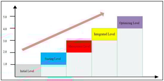 By classifying the application capabilities of prefabricated building BIM, the advantages and disadvantages of prefabricated building application capabilities are described, which is also the basis for constructing a maturity model of prefabricated building application capabilities to better guide practical operations. After studying the Capability Maturity Model [24], the BIM application capability maturity model for prefabricated buildings is divided into five levels, from low to high: Initial Level, Starting level, Management level, Integrated level, and Optimization level [25,26]. As shown in Figure 1.