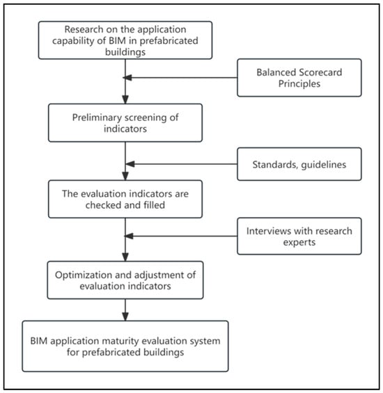 By combing and analyzing the relevant theoretical knowledge, we use the principle of the balanced scorecard for the initial identification of evaluation indicators [31], conduct a further screening of indicators in multiple dimensions, and then use the relevant literature and standards for the indicators to check the gaps and make up for the omissions, and then use the research and expert interviews through the questionnaire survey for the evaluation of indicators to optimize and improve the evaluation of the indicators. Ultimately, we obtain the scientific and effective evaluation of the maturity of the application of the BIM indicator system after heavy screening, the process of which is shown in Figure 2.