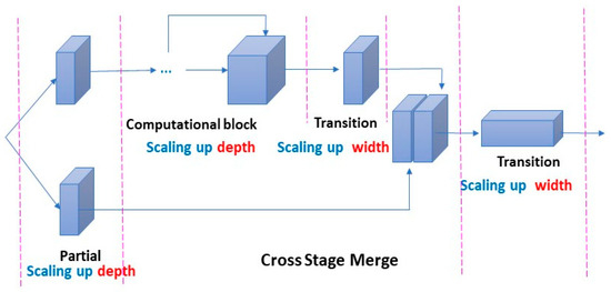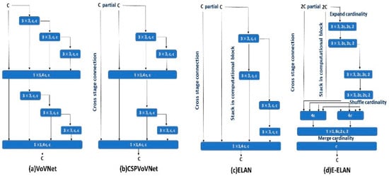 YOLOv7’s architecture leverages several key components to optimize detection performance. CBS (convolution, batch normalization, SiLU) is utilized for efficient feature extraction, while efficient layer aggregation networks (ELANs) maintain consistent feature sizes throughout the model. Additionally, extended ELANs (E-ELANs) enhance gradient learning across layers, improving training stability and detection accuracy (see Figure 3a–d). The model’s scalability allows input size and depth adjustments, balancing computational load and processing speed (see Figure 4) [36].
