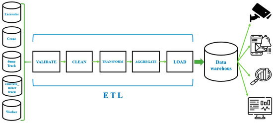 Convert images to TXT format for YOLOv7 compatibility and resize them to 320 × 320 pixels, a multiple of 32 as required by YOLO’s grid-based architecture. This resolution balances detection accuracy and real-time processing speed, which is critical for on-site hazard detection, enabling YOLOv7 to achieve over 30 FPS on mid-range hardware (as noted earlier in this section) for timely safety alerts. Higher resolutions like 640 × 640 could enhance accuracy for small objects (e.g., increasing mAP by 1–2%) and improve distance estimation in homography transformation with better feature points. However, they would increase inference time by 3–4 times, risking alert delays. A structured Extract–Transform–Load (ETL) process is essential for data integration and model application, ensuring high-quality input for object detection. The ETL workflow consists of three primary stages, as shown in Figure 5. The steps include the following: