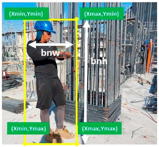 Image labeling involves marking the location and size of objects in each image, as depicted in Figure 8. The bounding box annotation process defines object detection areas, where bnw and bnh represent the width and height of the bounding box, respectively. This structured approach ensures that YOLOv7 can efficiently identify workers and machinery, improving the accuracy of real-time safety monitoring in dynamic construction environments.