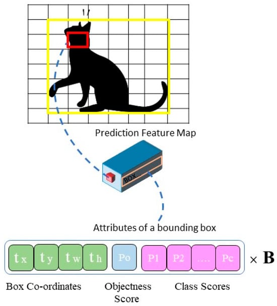 The YOLO detection method divides images into grid cells and predicts two bounding boxes per cell. IoU (intersection over union) assesses the overlap between detected and actual object boxes, with values close to one indicating high accuracy. Each bounding box contains five values (x, y, w, h, and confidence): x and y denote the object’s center in the grid cell, w and h represent its width and height, and confidence measures the likelihood of its presence. A higher confidence score suggests a higher probability of an object within the grid cell. The final results are refined using IoU thresholds and non-maximum suppression (NMS) (see Figure 9).