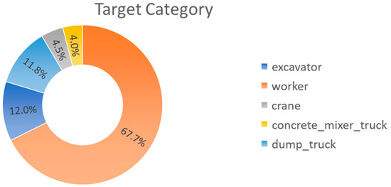 This study utilized a dataset of 8663 labeled construction site images to develop the YOLO-based image recognition system for construction safety. The dataset, with instance, counts, and performance metrics detailed in Table 2, was randomly split into training (6236 images, 70%), validation (1560 images, 20%), and test sets (867 images, 10%). A pie chart in Figure 10 illustrates the proportional distribution of detected instances across the five target object classes (workers, excavators, cranes, concrete mixers, dump trucks). The training process is optimized for object detection in built environments.