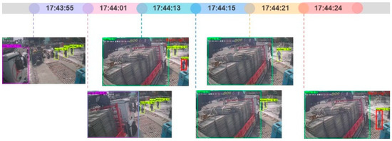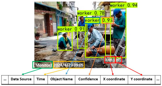 During the detection process, images showing the number of construction workers on site, data sources, object categories, coordinate positions, and execution time were integrated with the construction project log dataset (Table 3). Figure 11 shows the test results of the YOLO image detection model, with coordinates automatically converted to the center point of objects for a more precise representation of relative position.