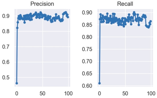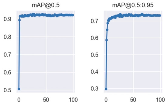 Precision is the proportion of correctly classified targets among all detected targets, while recall is the proportion of correctly identified targets among all actual targets. TP, FP, FN, and TN are confusion matrix parameters. AP is the area under the PR curve, with precision and recall as axes ranging from 0 to 1. P(k) represents precision, and rel(k) represents recall. mAP is the average AP across all object classes, indicating object detection accuracy, ranging from 0 to 1. Higher precision suggests greater model accuracy and reliability, while higher recall indicates better accuracy and comprehensiveness in capturing target objects. The changes in these values during training are shown in Figure 12.