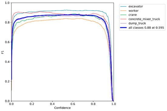 Moreover, the model’s practical application covers an area of 52 square meters within the camera’s field of view, demonstrating strong performance in detecting workers and machinery on construction sites. As shown in Figure 14, the model achieves an overall F1 score of 0.88 at a confidence level of 0.595. For machinery, the F1 score ranges from 0.87 to 0.92, while it consistently remains above 0.83 for workers.