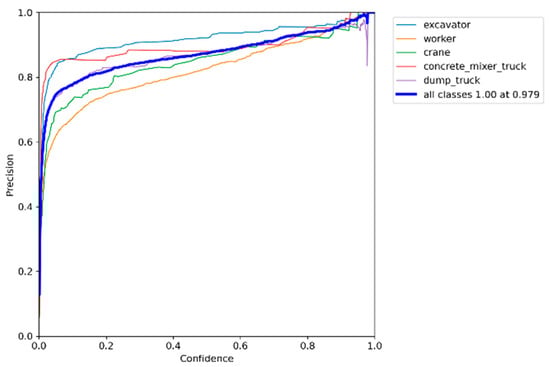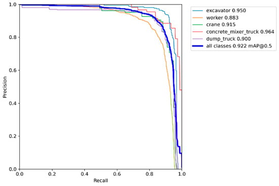 Figure 15 illustrates the precision curves for all classes, which approach 1.00 at high confidence levels, reaching 1.00 at a confidence level of 0.979. Figure 16 displays precision–recall curves, further validating the model’s effectiveness, with a mean average precision (mAP) of 0.922 at 0.5 IoU across all classes. The AP values remain consistently high, ranging from 0.883 for workers to 0.964 for concrete mixer trucks, underscoring the model’s ability and effectiveness in construction site object detection. These results are comparable to or exceed those reported in similar studies.