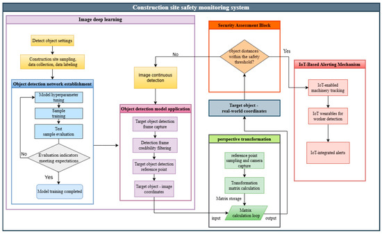 The construction industry faces persistent occupational health and safety challenges, with numerous risks arising from construction sites’ complex and dynamic nature. Accidents frequently result from inadequate safety distances and poorly managed work-er–machine interactions, highlighting the need for advanced safety management solutions. This study develops and validates an innovative hazard warning system that leverages deep learning-based image recognition (YOLOv7) and Internet of Things (IoT) modules to enhance construction site safety. The system achieves a mean average precision (mAP) of 0.922 and an F1 score of 0.88 at a 0.595 confidence threshold, detecting hazards in under 1 s. Integrating IoT-enabled smart wearable devices provides real-time monitoring, delivering instant hazard alerts and personalized safety warnings, even in areas with limited network connectivity. The system employs the DIKW knowledge management framework to extract, transform, and load (ETL) high-quality labeled data and optimize worker and machinery recognition. Robust feature extraction is performed using convolutional neural networks (CNNs) and a fully connected approach for neural network training. Key innovations, such as perspective projection coordinate transformation (PPCT) and the security assessment block module (SABM), further enhance hazard detection and warning generation accuracy and reliability. Validated through extensive on-site experiments, the system demonstrates significant advancements in real-time hazard detection, improving site safety, reducing accident rates, and increasing productivity. The integration of IoT enhances scalability and adaptability, laying the groundwork for future advancements in construction automation and safety management.