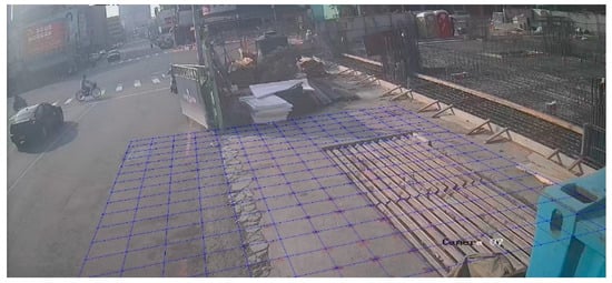 In the case study, a 2-megapixel camera is installed 4.5 m above the construction site entrance, angled downward at 30 degrees, to provide a comprehensive aerial view of construction activities. This setup uses a grid of 50 × 50 cm squares as a real-world coordinate system, allowing the conversion of pixel coordinates to real-world coordinates through a homography transformation matrix. This enables the system to estimate the safety distance between workers and machinery accurately. Figure 21 illustrates the data transformation matrix used for these calculations, enhancing object detection accuracy.