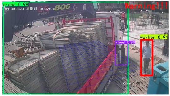 To enhance real-time safety monitoring, the system independently evaluates multiple hazardous events. For example, when construction vehicles enter the site, the system continuously tracks the safety distance between workers and machinery, with a threshold set at 6 m. Video frames are captured and processed by YOLOv7 to detect objects such as workers and vehicle components like wheels (the wheel will be hidden during detection to keep the screen clean). The bounding box coordinates are then mapped to real-world distances using homography and calibrated camera parameters. To improve accuracy, the system calculates the shortest distance between the centers of the tire and worker’s bounding boxes. If this distance falls below the safety threshold, alerts are triggered via the IoT module. Figure 22 illustrates this process, where a worker’s proximity to a vehicle tire triggers a “WARNING!!!” due to the close distance, indicating that a mechanical engineering vehicle is detected near the worker.