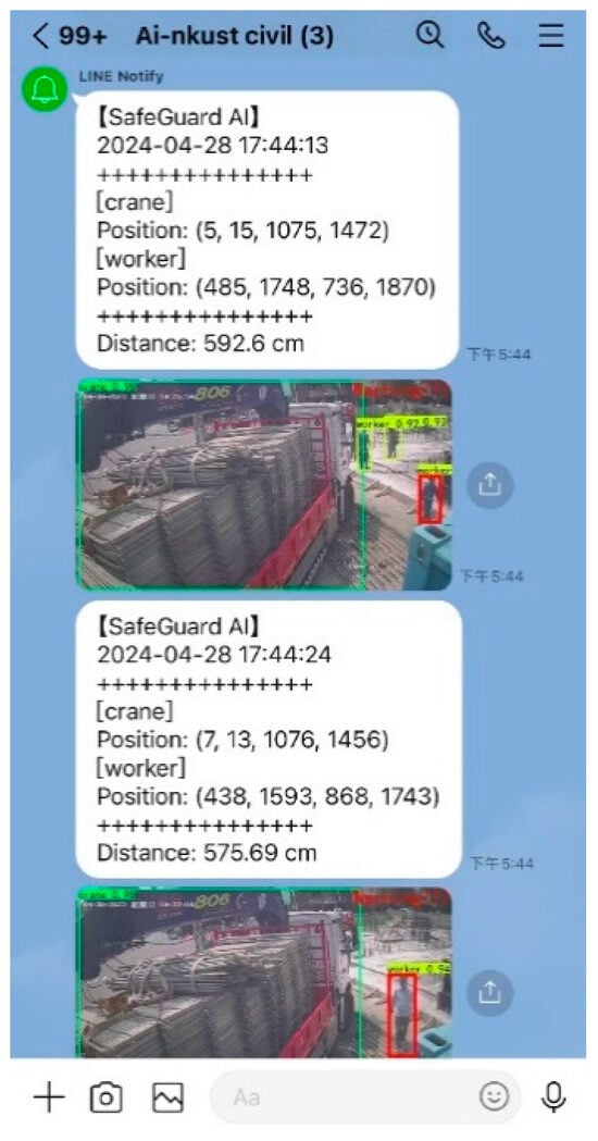 Building upon the use of Line Notify for energy control, as demonstrated by Arunyagool et al. (2021), this study leverages Line Notify as a hazard alert tool for construction sites [45]. Configured for a network recognition speed of 7 fps or higher, with the Line API limiting alerts to once every 5 s for optimal balance between speed and reliability, this system achieves an approximate 1 s latency between threat detection and text message delivery. IoT modules are integrated to deliver warnings to workers’ smart wearable devices, such as smart helmets and smartwatches, to enhance the warning mechanism further and broaden alert dissemination. These devices provide immediate haptic or visual notifications upon hazard detection. For instance, if a worker enters an unsafe proximity to heavy machinery, the IoT system can trigger a haptic or auditory warning on the worker’s wearable and notify the site manager via a mobile application, ensuring rapid hazard awareness and timely interventions to improve overall construction site safety.