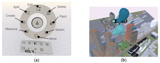 (a) User interface circle in Arkio, showing multiple functionalities. (b) Example collaborative design with Arkio.