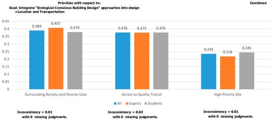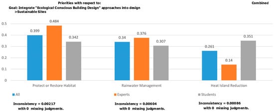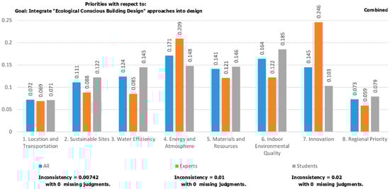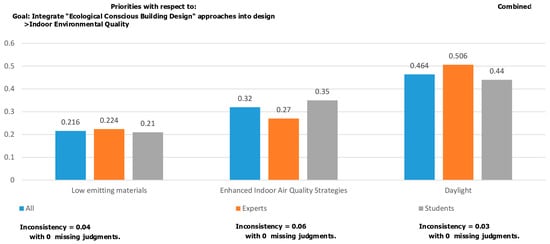The “indoor environmental quality” LEED criterion addresses the importance of designing spaces that value occupant health, well-being, and comfort and is the highest-rated criterion by students. Considering that the content of the curriculum is centered around designing architectural spaces, it is not surprising to see students’ attention on this criterion. Among its sub-criteria, “daylight” emerges as the most highly rated factor overall (0.464), with experts (0.506) placing slightly greater emphasis on it compared to students (0.44). There seems to be a consensus on the benefits of natural lighting in enhancing occupant productivity and reducing energy consumption while aiming to improve overall indoor experiences. “Enhanced indoor air quality” emphasizes air quality control measures such as ventilation, pollutant filtration, and humidity management. Lastly, “low-emitting materials” (0.216 overall) received the lowest relative rating. Nevertheless, the literature recognizes it as impactful in reducing volatile organic compounds (VOCs) in building interiors [68]. The results indicate that professionals prioritized daylighting strategies, and students strongly emphasized air quality improvements, reflecting different approaches to creating healthier indoor environments (Figure 8).