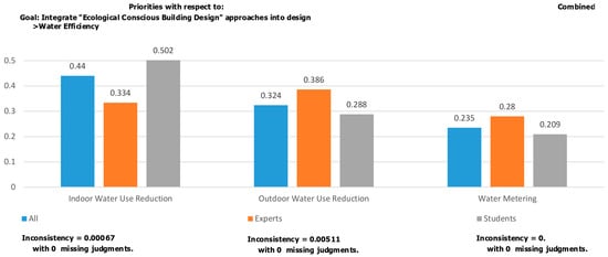Students rated the “water efficiency” criterion relatively higher than experts. This criterion focuses on minimizing water consumption while promoting responsible water management practices. The sub-criterion “indoor water use reduction” is the highest-rated overall (0.44), with students prioritizing it more (0.502) than experts (0.334). In contrast, reducing outdoor water use is of greater importance for experts than students. Experts highlighted their broader long-term focus on sustainable landscaping, drought-resistant vegetation, and irrigation efficiency as critical factors in water efficiency (Figure 5). These differences in prioritization show differences in opinion regarding water efficiency; while students emphasize immediate consumption reduction, experts highlight integrated, large-scale water management strategies.