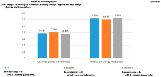 The “energy and atmosphere” criterion is the highest-rated criterion (especially from students’ perspective). The analysis of sub-criteria indicates that “renewable energy production” is the most significant factor (0.616 overall), slightly more emphasized by students than experts; this suggests a strong recognition of integrating renewable energy sources, such as solar and wind power, while aiming for ECBD. Nevertheless, “optimizing energy performance” also holds substantial weight, indicating a professional emphasis on efficiency measures such as improved insulation, advanced HVAC systems, and passive design strategies (Figure 6). These findings highlight a shared commitment to energy-conscious design, with students slightly inclined toward renewable energy solutions. At the same time, experts prioritized both renewable energy integration and enhancing overall energy performance in buildings.