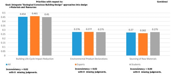 The “materials and resources” criterion—second highest ranked by experts overall—focuses on minimizing the environmental impact of building materials through sustainable selection, responsible sourcing, and efficient use. Among the sub-criteria, “building life-cycle impact” reduction is the most highly rated by both groups concerning ECBD. This can be interpreted as a shared understanding of the dire need to evaluate the entire lifespan of materials, from source and processing to disposal. Additionally, the sub-criteria “environmental product declarations” and “sourcing of raw materials” are also considered significant, with only minor differences between experts and students (Figure 7). It could be argued that there is a growing awareness of the environmental transparency of materials and the importance of responsibly sourced raw materials in reducing ecological impact.