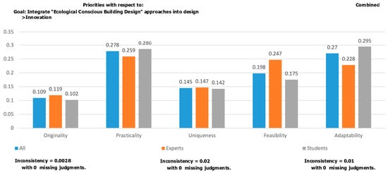 The essence of creative and forward-looking approaches in ECBD is encapsulated in the criterion “innovation”. The analysis shows the most significant difference between expert and student evaluations regarding this criterion. While experts rated “innovation” as the highest priority (0.246), students considered it less important (0.103). This suggests that experienced professionals emphasize innovative solutions to push the boundaries of ECBD, while students may focus more on established criteria. What is more, among the sub-criteria, “practicality” (0.278 overall) and “adaptability” (0.27 overall) are the most valued aspects, with students prioritizing adaptability more than experts. Experts, however, rated “feasibility” (0.247) higher than students (0.175), indicating a preference for innovative solutions that are also viable in real-world applications. “Originality” (0.109) and “uniqueness” (0.145) were rated lower across both groups, suggesting that while creativity is encouraged, it is most valued when paired with practical and adaptable solutions (Figure 9).