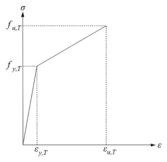 The steel adopts the classic bilinear constitutive mechanics model, as shown in Figure 1, which considers the elastic and plastic stages of the steel to determine the yield strength and ultimate strength of the steel at different temperatures. The reduction factors for yield strength and modulus of elasticity of plain carbon steel are taken in accordance with the recommendations of Eurocode EN1993-1-2 [24], as shown in Figure 2, where fy is the yield strength of the steel at room temperature and E is the elastic modulus of the steel at room temperature; fy,T is the yield strength of steel at high temperature, and ET is the elastic modulus of steel at high temperature.