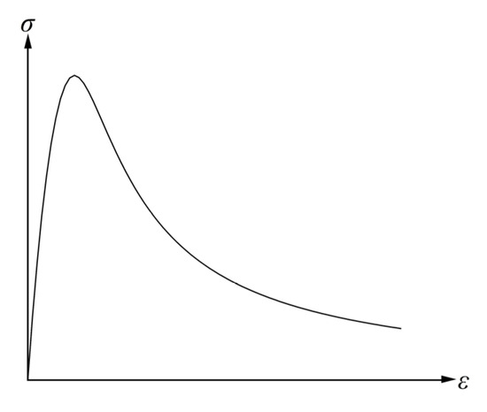 Based on Equation (8), the compressive stress–strain constitutive curve of concrete is obtained as shown in Figure 3. For the tensile stress–strain relationship, the constitutive model proposed by Hong [29] is adopted, which, combined with Equation (9), yields the constitutive curve presented in Figure 4.