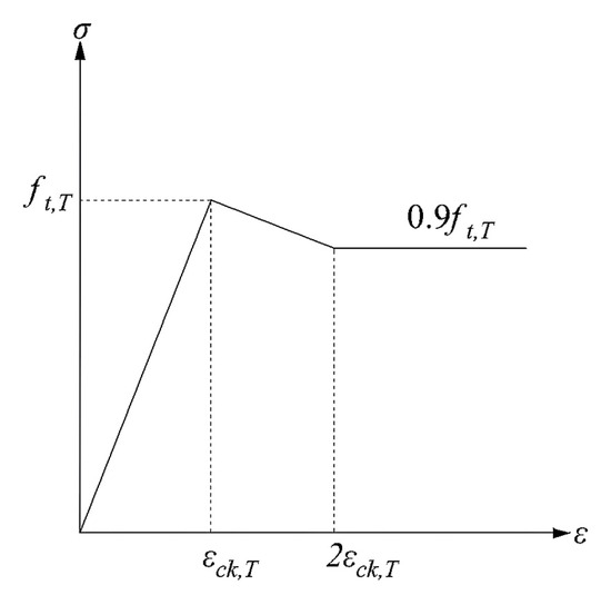 Based on the constitutive model of concrete at normal temperature, Zhenhai Guo and Wei Li et al. [28] experimentally investigated the compressive stress–strain relationship of concrete under high temperatures. This study adopts their experimentally derived Equation (8):