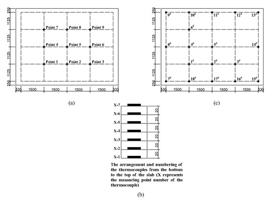 Layout diagram of measuring points of the RC slab: (a) layout diagram of the thermocouples; (b) distribution diagram of thermocouples along the thickness of the slab; and (c) layout of the out-of-plane differential displacement sensors (The “#” is the mark of the out-of-plane displacement measuring point).