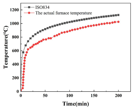 The temperature of the RC slab was measured using self-made nickel–chromium/nickel–silicon thermocouples embedded in the slab, with a spacing of 20 mm between them. Seven concrete thermocouples were arranged along the thickness direction at each measuring point, totaling nine embedded measuring points, as shown in Figure 6a,b. In addition, one thermocouple shall be installed on the steel rebars near both the top and bottom of the slab. The thermocouple data was automatically collected by an HP data acquisition unit (Agilent 34970A, Keysight Technologies, Santa Rosa, CA, USA), with the measurement range meeting the requirements of the actual fire curve, the instrument was originally produced in Santa Rosa, California, the United States, and the manufacturer is Keysight Technologies. The out-of-plane displacement of the RC slab was measured using a differential displacement transducer (LVDT) with a measurement range of 200 mm to 500 mm. The arrangement of measurement points is shown in Figure 6c. The RC slab was placed on a horizontal fire resistance furnace for testing. Through the computer-controlled fire testing system, the heating program was executed according to the temperature rise curve specified in Equation (16). The actual furnace temperature curve was obtained via feedback signals from thermocouples installed inside the furnace, which was used to heat the RC slab. As shown in Figure 7, both the standard heating curve and the actual heating curve are presented. It can be observed that the fire curve used in the test essentially meets the heating requirements of the standard fire. The entire experimental scenario of the RC slab is shown in Figure 8.