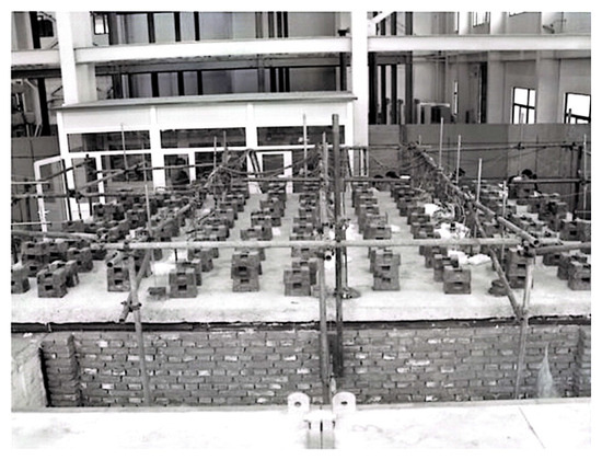 The support of the four-sided simply supported plate adopts ball bearings and rollers, with steel balls as the ball bearings, and the diameter of both the steel balls and rollers is 100 mm. The experiment adopts a constant load heating scheme, where iron weights are stacked on the plate and uniformly distributed loads are applied. The experiment is conducted in five stages, with each stage being 0.4 kN/m2, for a total of 2.0 kN/m2. The fire temperature rise curve used in the experiment is the ISO 834 standard temperature rise curve, and the test temperature is determined by Equation (16). Additionally, the heating curve from reference [40] can also be used for fire resistance analysis of structural members.