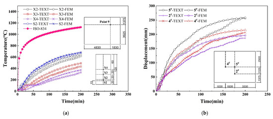 Using ABAQUS software, a thermal–mechanical coupling method was employed to obtain the temperature and displacement data of the RC slab. The heating curves of the bottom reinforcement (S2) and concrete (X2, X3, and X4) were plotted, and the simulation results (FEM) were compared with the experimental results (TEST), as shown in Figure 9a. The out-of-plane displacement curves of measuring points 2#, 4#, and 5# under high temperature were plotted, and the simulation results (FEM) were compared with the experimental results (TEST), as shown in Figure 9b. Affected by experimental methods, equipment, and material inhomogeneity, there is a certain deviation between theoretical and actual results. During theoretical calculations, the thermal conductivity and specific heat capacity were underestimated, while the thermal expansion coefficient was overestimated. Additionally, the model failed to adequately account for water vapor migration at high temperatures, leading to overall higher predictions for structural temperature and displacement. However, the simulation and test curves show consistent trends with good agreement. Therefore, the thermal coupling simulation method and material constitutive model used in this article can reasonably predict the thermal conductivity and mechanical properties of steel and concrete materials at high temperatures.