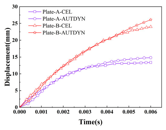 The author of the literature obtained peak displacements of 15 mm and 29 mm for plate A and plate B at the mid-span after explosion through experiments and 13 mm and 24 mm through numerical simulations. In this paper, the CEL fluid structure coupling method was used to obtain numerical simulation results of 14 mm and 26 mm, respectively. It can be observed that the simulation results are smaller than the experimental results. This discrepancy arises from two main factors: first, the actual test exhibited some looseness in the plate supports, whereas the numerical analysis assumed completely fixed supports; second, potential discrepancies may exist between the actual explosive parameters/detonation locations and those used in the simulation. Figure 11 shows the comparison between the numerical simulation results of ABAQUS finite element software and the numerical simulation results of the authors of the literature using AUTDYN software. As can be seen in Figure 11, the curves are in good agreement, so this paper adopts the strain rate model and the CEL fluid–solid coupling method, which can reasonably predict the mechanical properties of steel and concrete materials under the explosion load.
