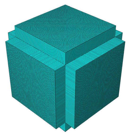 Finally, meshing was performed on all structural components, with both the element type and size properly configured. During the heat transfer analysis, a 4-node heat transfer quadrilateral shell element (DS4) is used for the steel plate, a 2-node heat transfer link element (DC1D2) is used for the stud, and an 8-node linear heat transfer brick element (DC3D8) is used for the concrete. During the explicit dynamic analysis, a 4-node doubly curved thin shell element (S4R) is used for the steel plate, a 2-node linear 3-D truss element (T3D2) is used for the stud, an 8-node linear brick element (C3D8R) is used for the concrete, an 8-node linear Eulerian brick element (EC3D8R) is used for the air domain, and an 8-node linear brick element (C3D8R) is used for the TNT. To determine the optimal mesh size, a mesh sensitivity analysis was conducted for both the fire-exposed and blast models, testing three different element sizes: 5 mm, 10 mm, and 15 mm. By comparing the results with reference data and images, it was found that mesh sizes within the 5–10 mm range provided excellent fitting accuracy. Considering both computational precision and cost, a final mesh size of 10 mm was selected for this study. To prevent stress wave reflection, the six surfaces of the air domain are meshed using a single sweep mesh pattern, with the sweeping direction oriented toward the infinite boundary. The meshing schemes for both the SCS slab and air domain are illustrated in Figure 14 and Figure 15, respectively.
