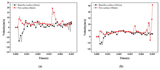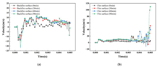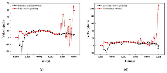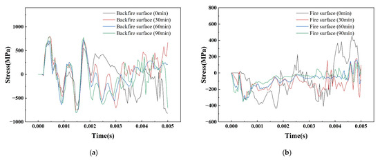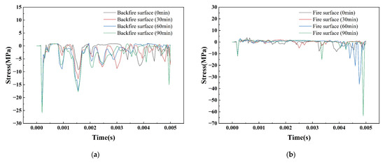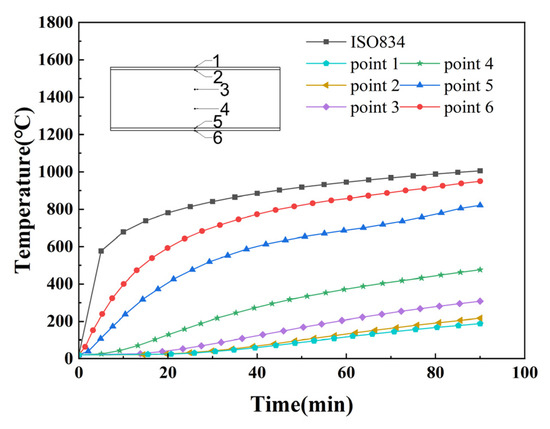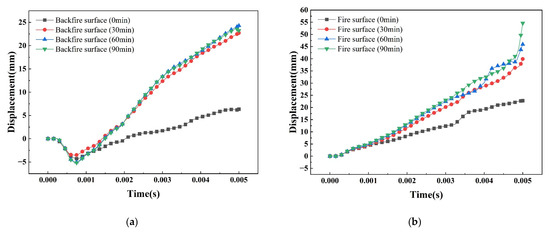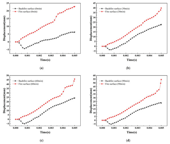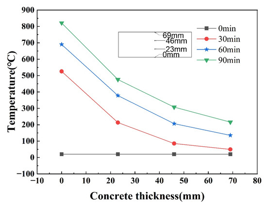 Figure 16 shows the temperature–time curve of the member at different positions at the mid-span of the SCS slab. From the figure, it can be seen that the temperature of each measurement point with the increase of the fire time shows a nonlinear increasing trend, and the warming trend is similar. Due to the existence of the contact thermal resistance between the steel plate and the concrete, the junction of the steel plate and the concrete on the fire surface has an obvious hysteresis in the warming trend, and the difference in temperature between the steel plate on the fire surface and the concrete is 128 °C at 90 min. But this hysteresis decreases from the concrete in the core area to the steel plate on the back fire surface, and the temperature difference between the steel plate on the back fire surface and the concrete junction is only 28 °C at 90 min. Figure 17 shows the graph of the peak temperature of the cross-section of concrete as a function of thickness under different fire exposure times. It can be seen that within the same fire exposure time, the cross-section temperature of concrete shows a nonlinear decreasing trend with increasing thickness, and there is an uneven distribution of temperature within the cross-section. Due to the deterioration of the mechanical properties of the material at high temperatures and the uneven distribution of temperature fields, the material undergoes non-isothermal deformation, resulting in a decrease in the blast resistance performance of the SCS slabs.