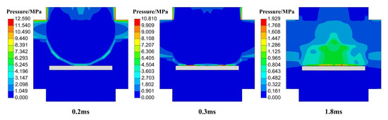 The shock wave propagation process in the air is shown in Figure 18. TNT explosives in the air explosion instantly form a group of explosives to occupy the original space of the high-temperature, high-pressure gas. This group of gases violently pushes the surrounding air, at the same time generating a series of compression wave propagations in all directions, and each compression wave finally superimposes into an incident shock wave. At 0.2 ms, the incident shock wave reaches the blast face. Due to the existence of the SCS slab, shock waves cannot be bypassed on the surface of the slab; the blast-facing surface of the rigid slab will act like the ground. At this time the propagation rate of the explosive shock wave will plummet to zero. At 0.3 ms, a large amount of gas had already accumulated on the blast-facing surface of the slab; gas pressure and density gradually superimposed to a certain extent. The explosion of the shock wave will be diffused in the opposite direction to form a reflection of the shock wave, and when the reflection of the wave and the incident wave overlap, then the formation of the Mach wave occurs. The incident wave, reflected wave, and Mach wave will form three wave points [48] on the blast-facing surface of the slab, and after the three waves intersect on the blast face of the plate, they will continue to spread along the slab face in all directions. At 1.8 ms, this diffusion phenomenon can be clearly observed. The shock wave waveform formed by the target measuring point in the air is shown in Figure 19. It can be seen that when the shock wave reaches the measuring point, the air pressure will quickly rise to the peak overpressure. After the shock wave, the air pressure gradually decreases to the initial pressure state. Subsequently, due to the pulsating effect of the explosive products, a secondary shock wave will be formed here, and this process will be repeated until the initial pressure state is restored again.