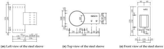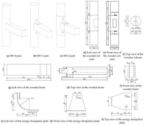 The SW-0 specimen is defined as a pure wooden beam–column joint without any steel reinforcement, relying solely on mortise–tenon connections to transfer internal forces. The joint of SW-1 specimen is reinforced with energy dissipation plates, while the joint of SW-2 specimen is reinforced by steel sleeve with energy dissipation plates based on the SW-0 joint. The processing dimensions of the wooden beam and columns, energy dissipation plates, and steel sleeves are shown in Figure 1.