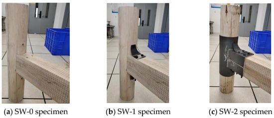 Based on the above designed component machining dimensions, the wooden beams, wooden columns, steel sleeves, and other components are fabricated in wood and steel workshops, respectively. The assembly steps for the SW-2 wood specimen reinforced with a steel sleeve and two energy dissipation plates are as follows: firstly, the steel sleeve was placed at the top of the wooden column, and the mortise and tenon were aligned. Then, the steel sleeve was gently tapped by a rubber mallet to ensure it was centered on the wooden column. Secondly, the wooden beam was inserted into the beam end of the steel sleeve, and the beam end was lightly tapped with the rubber mallet to ensure tight contact with both the steel sleeve and the wooden column. Thirdly, the energy dissipation plates were placed above and below the steel sleeve and temporarily secured to ensure the bolt holes were aligned. Finally, high-strength bolts were employed for the bolt connection to complete the assembly. The final assembly of the SW-0, SW-1, and SW-2 specimens is illustrated in Figure 2.